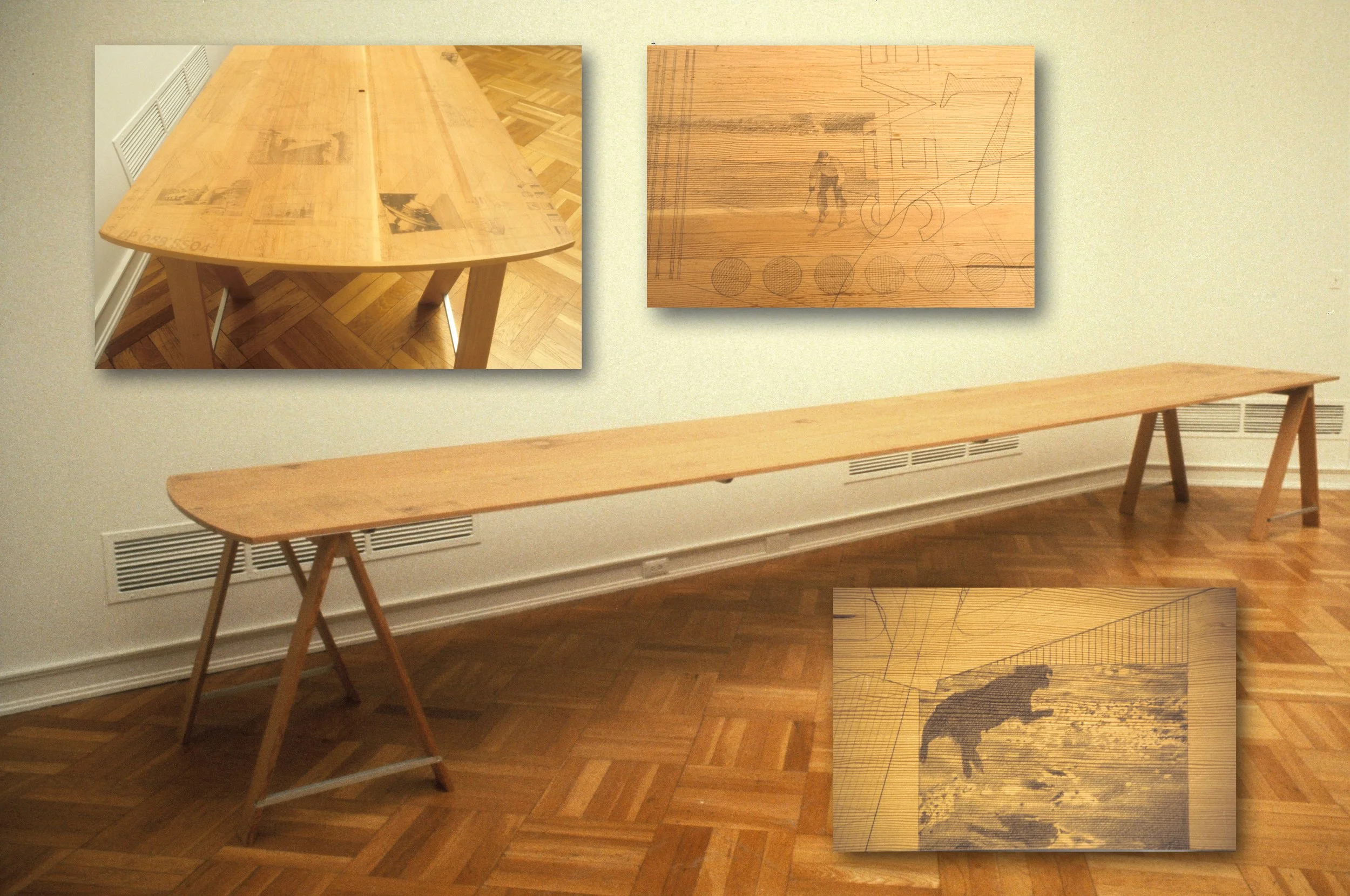 My most recent and rewarding area of work has been large fabricated and drawn installations, like the sliding wood panels of “Changing Center” in VCA’s lobby. These installations are also the most challenging and time-consuming pieces I’ve worked on: 6 – 12 months is typical. They often stand in large, high-traffic entry spaces, so I feel my job is to try to stop people and make them ponder the story or history I’m presenting. Hopefully, they’ll want to return for another look, or better yet, bring a friend along. I’m interested in that narrow zone between the illusion of 2-dimensional drawing and 3-dimensional fabricated surfaces, between visual form and storytelling. The drawn part requires a great deal of research and time-consuming rendering; the structural fabrication takes a good deal of engineering and craftsmanship. The combination of all that thrills me, although each one of the large pieces more or less takes over our home, studio, and shop, until it installs. Juli has been very understanding and supportive when the house is taken over.